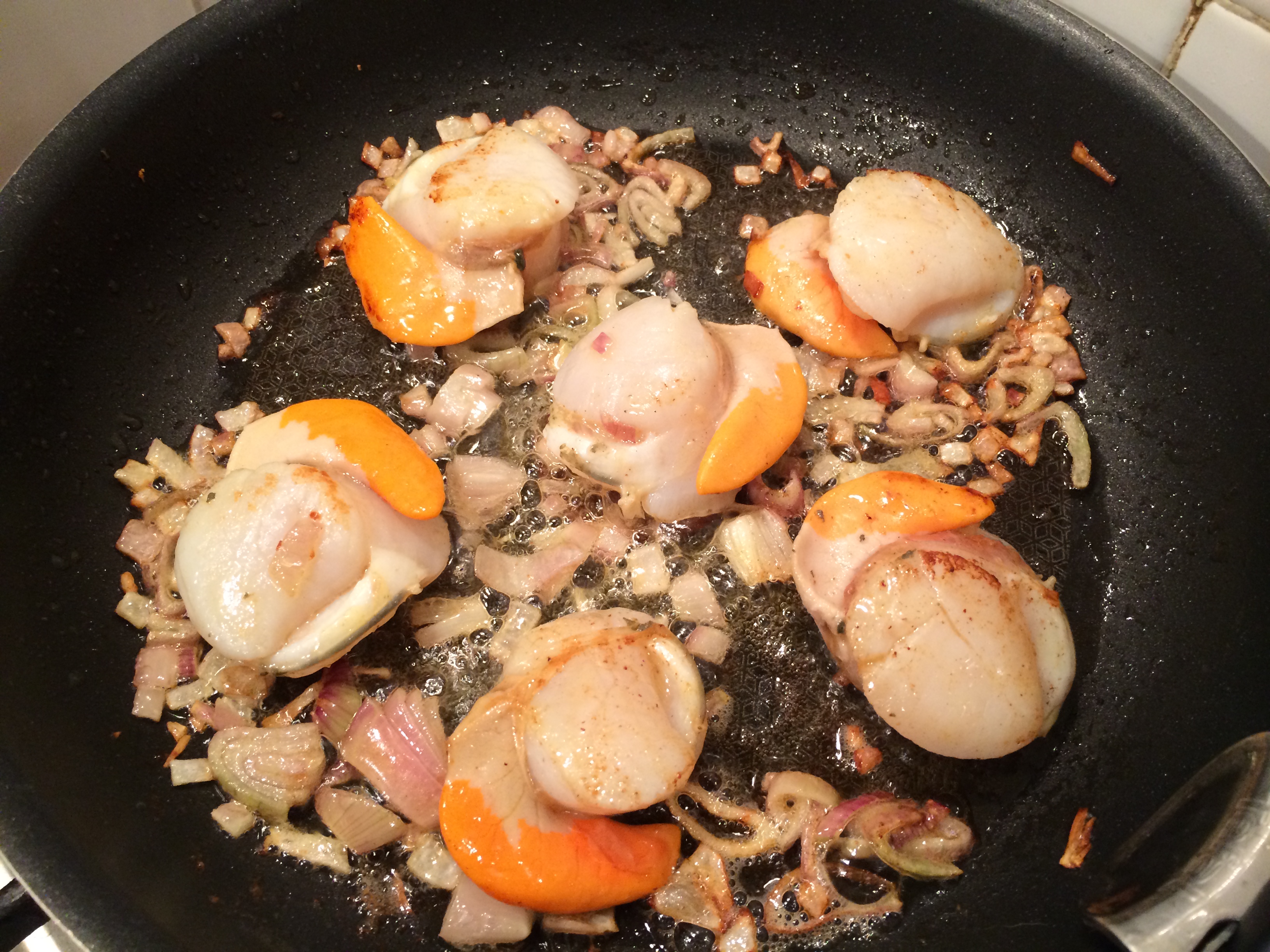Quand la poêle est bien chaude (et avant que les échalotes ne soient trop cuites), déposez vos St Jacques. Tournez-les une fois qu’elles sont légèrement dorées.