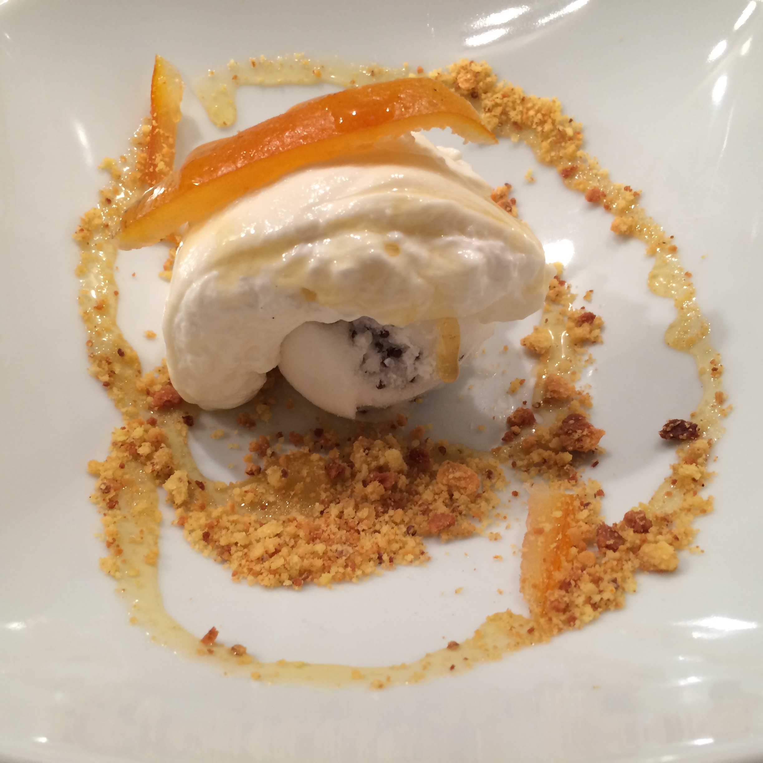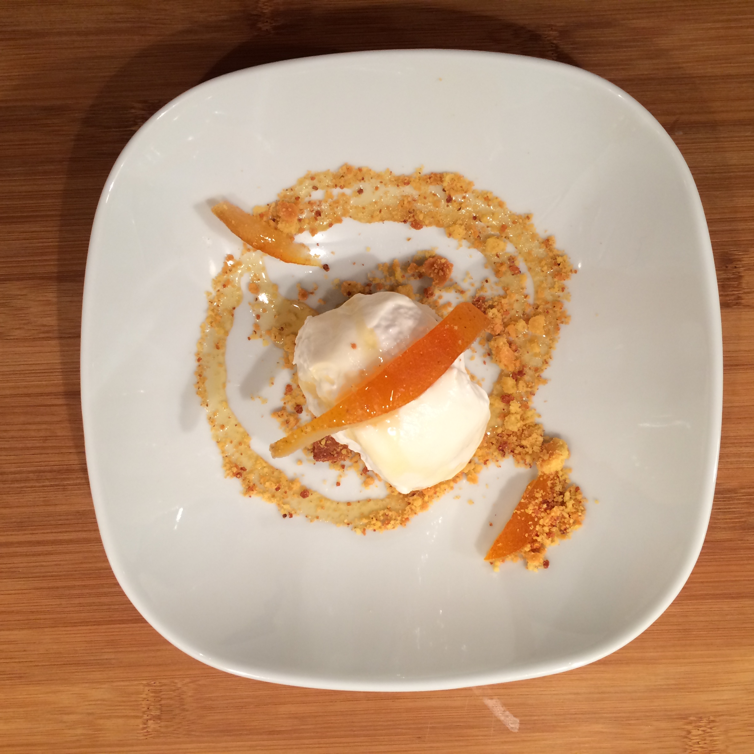 Dressage: Disposez une boule de glace à la moutarde dans une assiette creuse. Posez le quart de la burrata au dessus de la boule de glace. Arrosez d’un peu de miel. Parsemez de votre biscuit écrasé. Posez un ou deux morceaux d’orange confite au dessus de la burata.