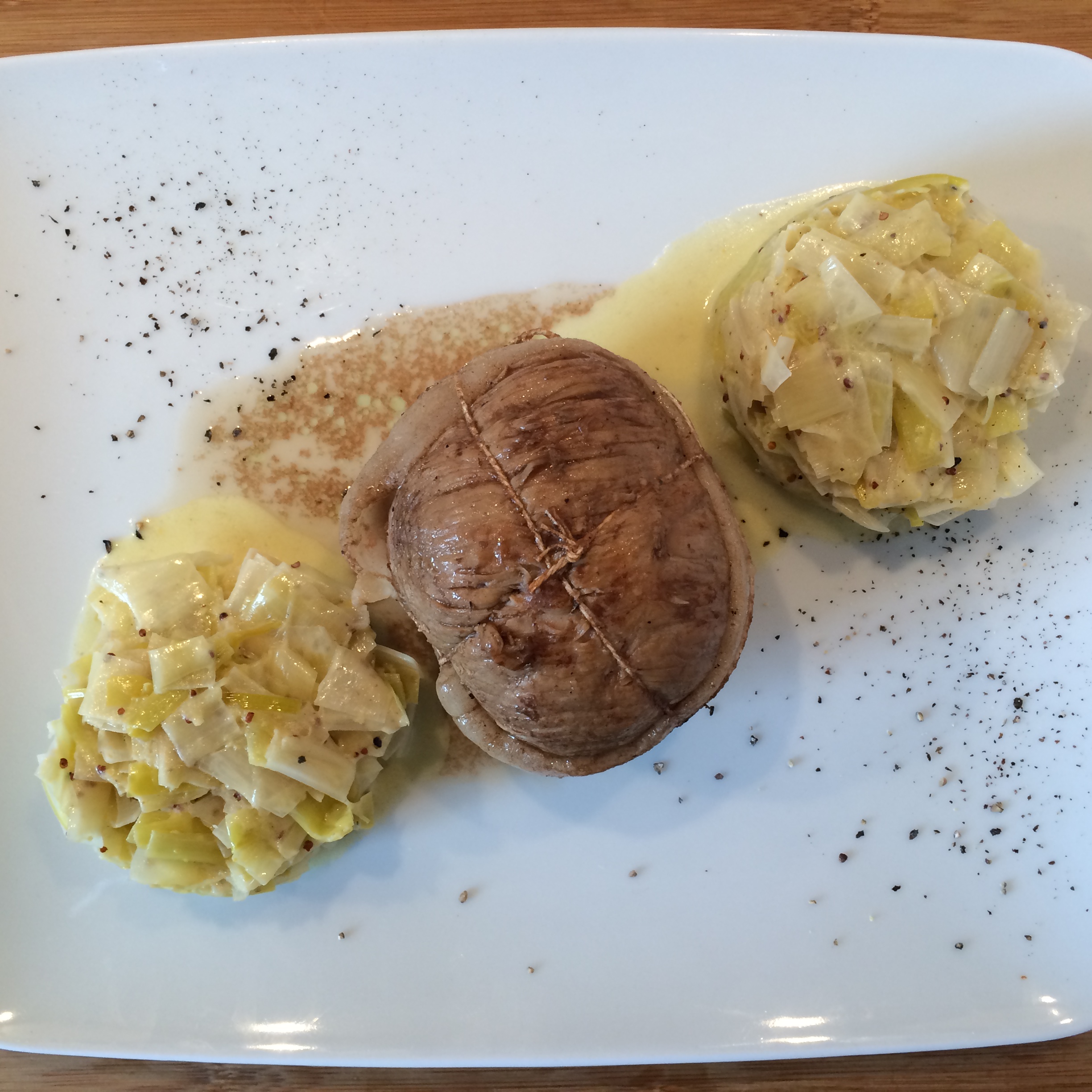 Comme vous le voyez sur les photos, plusieurs accompagnements possibles: raviolis au basilic, fondue de poireaux, risotto. Vous pouvez également épaissir la sauce en fin de cuisson, avec de la Maïzena et un carré de chocolat noir (comme sur le visuel avec le risotto) ou laisser les paupiettes dans leur jus (comme sur le visuel avec la fondue de poireaux).