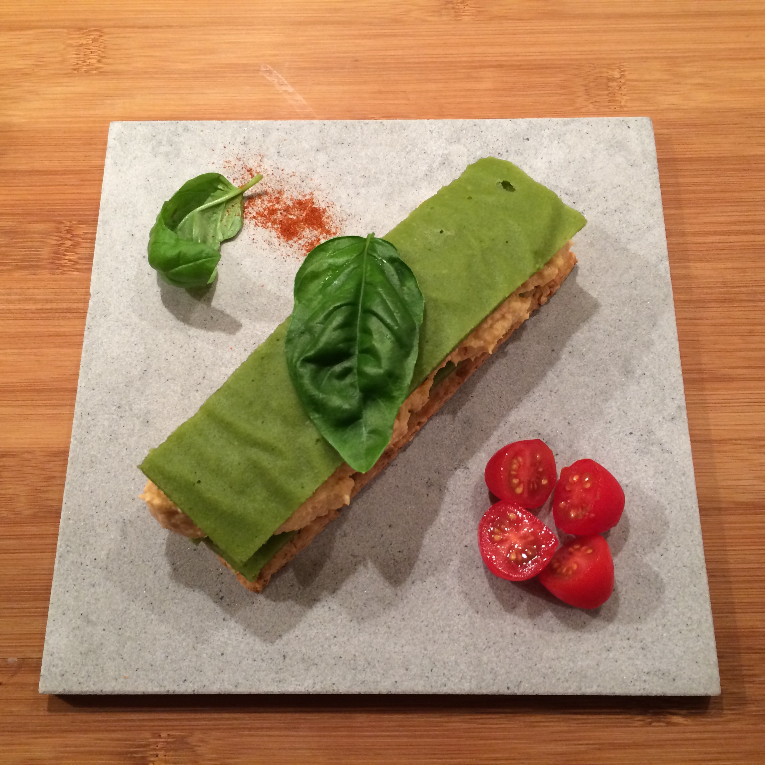 Dressage: Disposez un biscuit dans une assiette plate. Puis une feuille de gelée de haricots verts. Puis la mousse de homard. Puis une feuille de gelée de haricots verts. Disposez quelques tomates cerise coupées en deux. Un filet d’huile d’olive. Une feuille de basilic. Une pointe de piment.