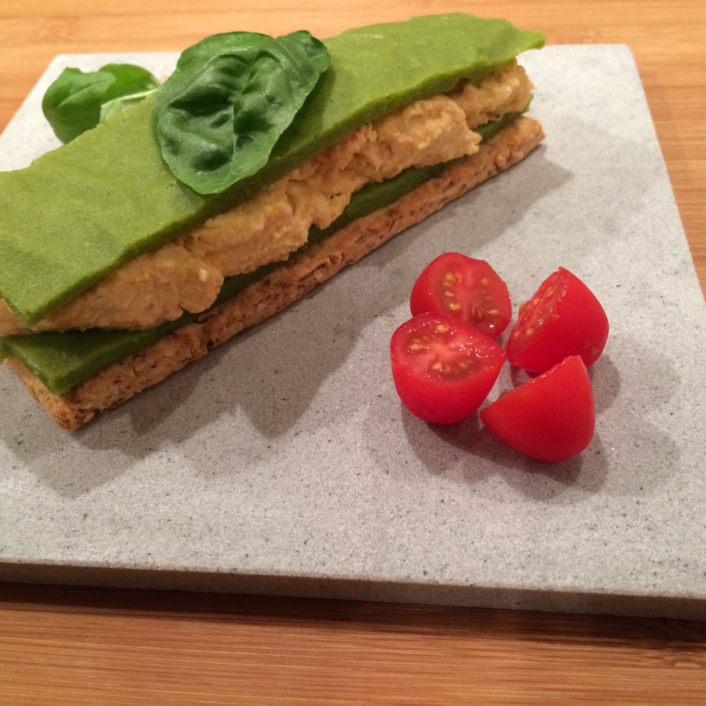 La gelée de haricots verts: faites bouillir deux poignées de haricot vert. Égouttez. Mixez avec 1/4 de verre de champagne. Ajoutez 8 tranches de gélatine que vous aurez préalablement fait ramollir dans un bol d’eau froide. Étalez sur du papier sulfurisé. Couvrez avec une autre feuille de papier sulfurisé. Mettez au réfrigérateur 1h. Découpez des rectangles de la même taille que celle des biscuits.